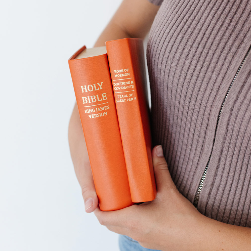 Crafted by hand and with an abundance of love and care, this hand-bound leather Bible is a beautiful way to treasure up the word of God. Each one is made from the standard King James LDS Bible and features marigold orange lambskin leather for a luxurious and soft feel. It includes one satin ribbon in the color of your choice; add up to four ribbons for a small fee. We have 12 ribbon colors to choose from for the perfect match. Add a name on the front of a personalized touch. This set of...