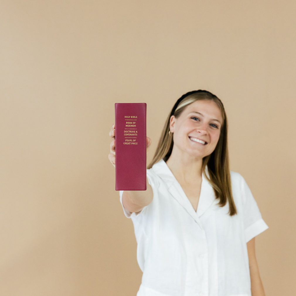 Crafted by hand and with an abundance of love and care, this hand-bound leather quad is a beautiful way to treasure up the word of God. Each one is made from the standard quadruple combination edition of the scriptures and features a red plum sheepskin leather for a luxurious and soft feel. It includes two satin ribbons in the color of your choice; add up to five ribbons for a small fee. This set of red LDS scriptures was designed to help you fall in love with your scriptures all over...