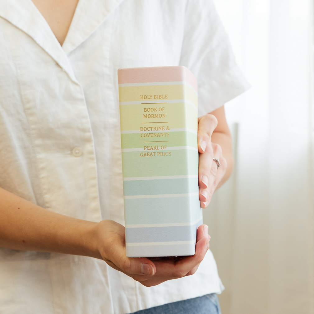 Delight in the charm of patterned scriptures and find a new way to express your faith and personality as you engage with the Holy Scriptures. Our patterns are professionally designed and printed on genuine lambskin leather before being hand-bound with love and care. Brighten your scripture study with this sweet sherbet rainbow. This design is a reminder that good times will come again, just as rainbows appear after the storm. These scriptures are a great gift for baptisms, young women, and...