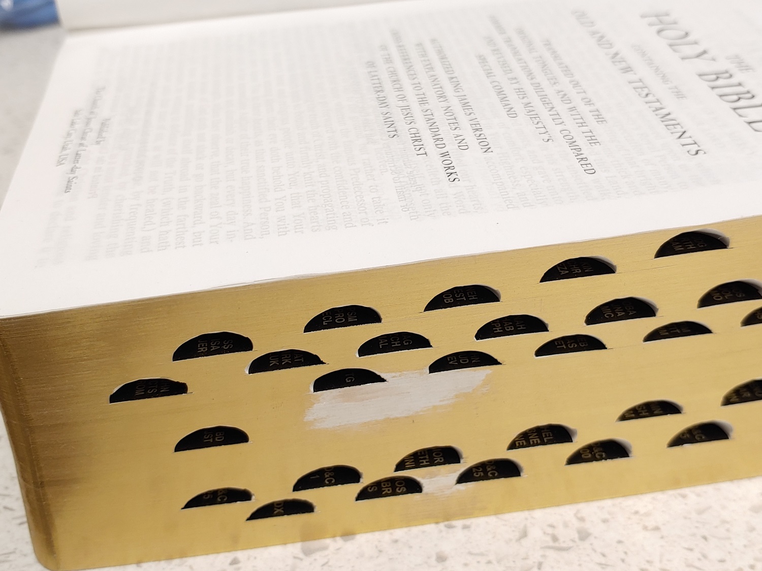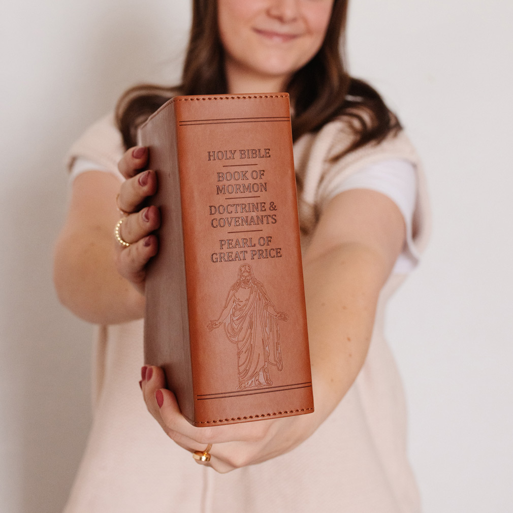 Crafted by hand and with an abundance of love and care, this hand-bound leather quad is a beautiful way to treasure up the word of God at an affordable price. These scripture blocks are nearly perfect, but have enough flaws that we can't use them for our typical binding process. Your quad will be bound perfectly from an imperfect book block. Each one is made from the standard quadruple combination edition of the scriptures and features simulated leather for a luxurious and soft feel. It...