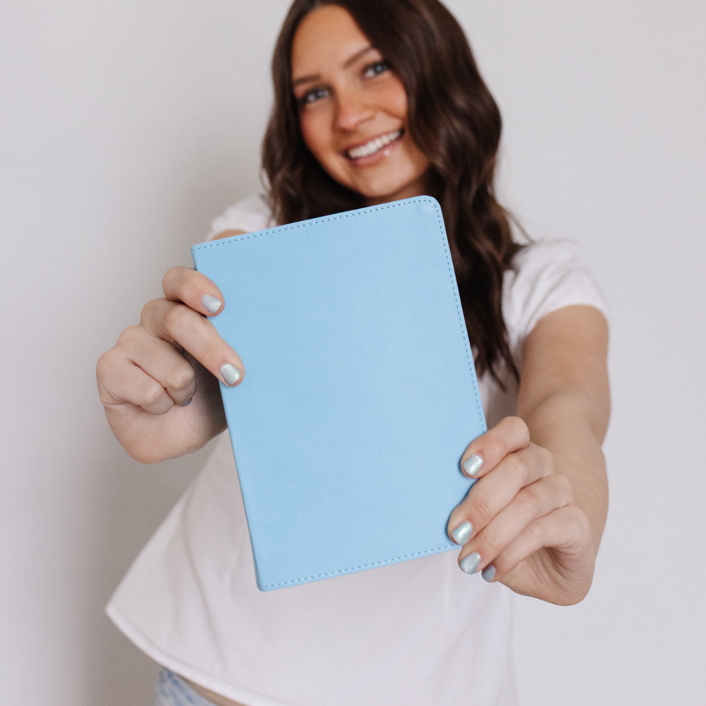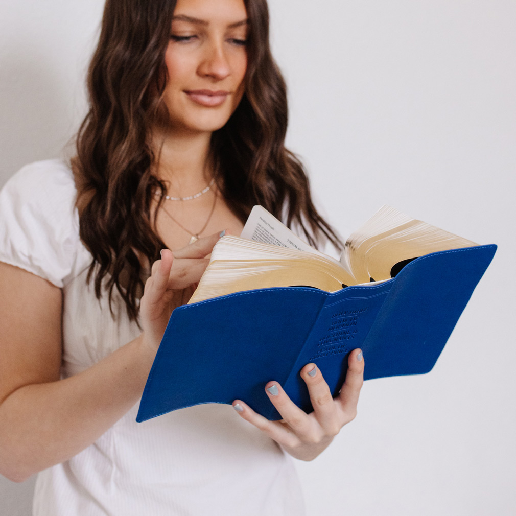 Our breezy blue simulated leather quad is a new addition to our collection of premium hand-bound scriptures. The cover is made from buttery soft faux leather and features stitching details and...