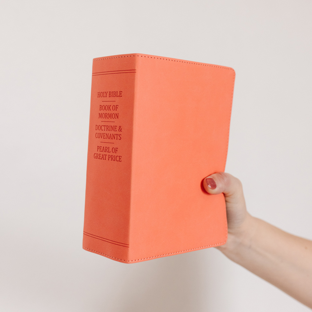 Our coral pink simulated leather quad is a new addition to our collection of premium hand-bound scriptures. The cover is made from buttery soft faux leather and features stitching details and a modern imprinted spine design. Each quad is carefully hand-bound at our local offices, ensuring quality craftsmanship in every detail. To make your scriptures even more personal, we offer customization options, allowing you to choose from a variety of ribbon markers and add your name with...