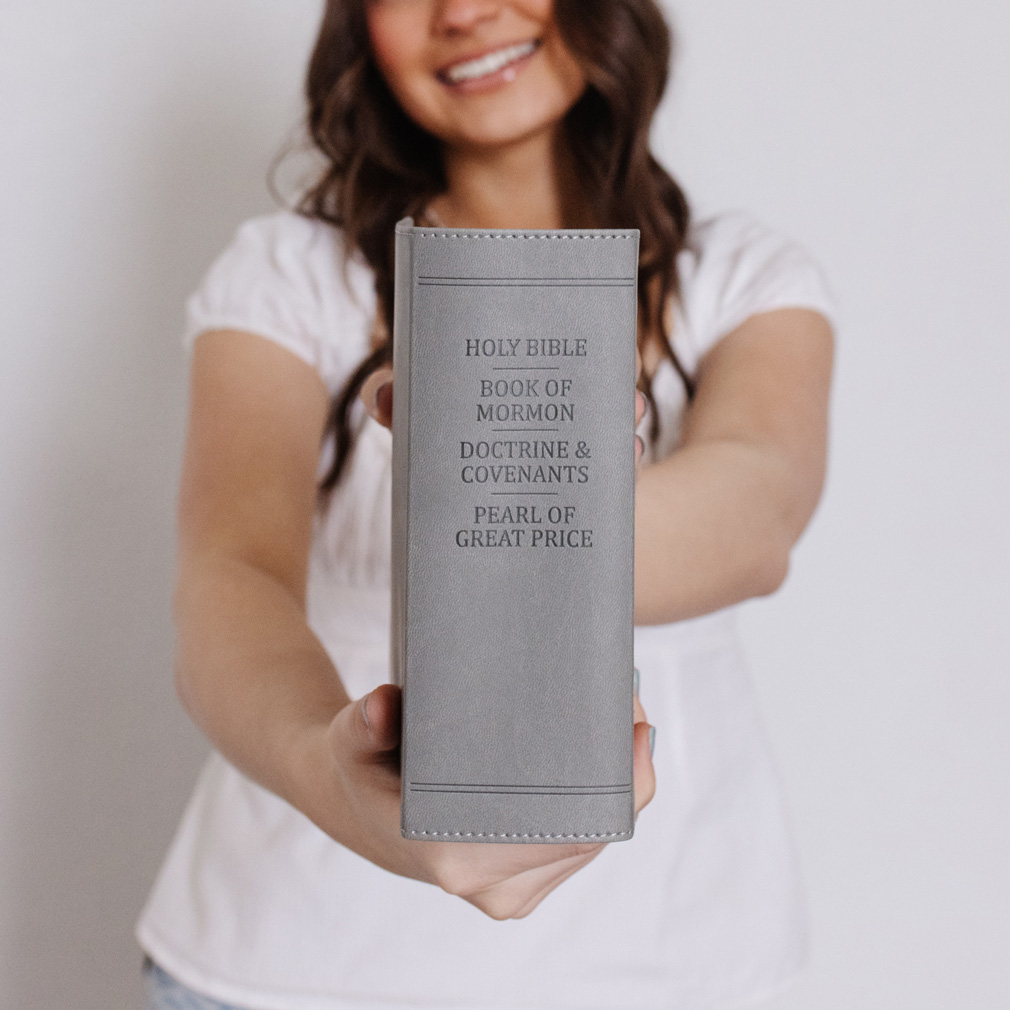 Our falcon gray simulated leather quad is a new addition to our collection of premium hand-bound scriptures. The cover is made from buttery soft faux leather and features stitching details and a modern imprinted spine design. Each quad is carefully hand-bound at our local offices, ensuring quality craftsmanship in every detail. To make your scriptures even more personal, we offer customization options, allowing you to choose from a variety of ribbon markers and add your name with...