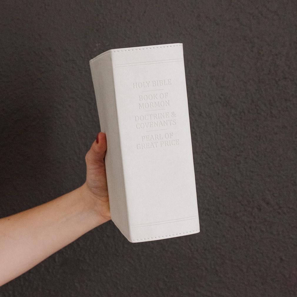 Our cloud white simulated leather quad is a new addition to our collection of premium hand-bound scriptures. The cover is made from buttery soft faux leather and features stitching details and a modern imprinted spine design. Each quad is carefully hand-bound at our local offices, ensuring quality craftsmanship in every detail. To make your scriptures even more personal, we offer customization options, allowing you to choose from a variety of ribbon markers and add your name with...