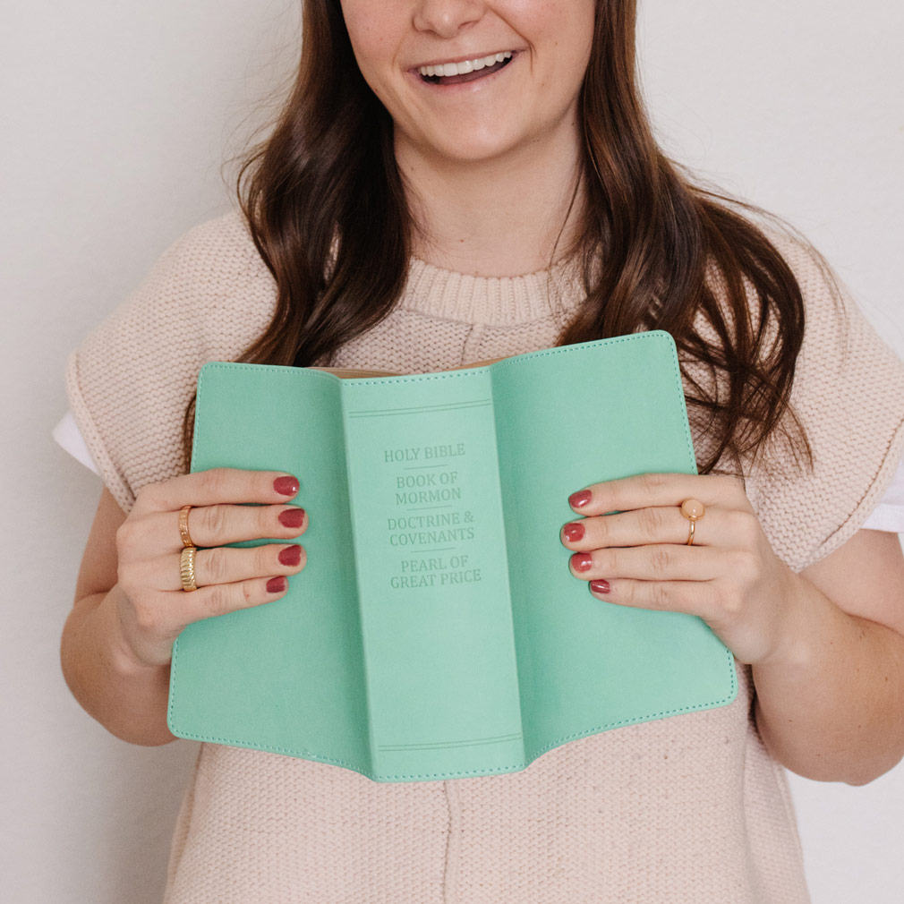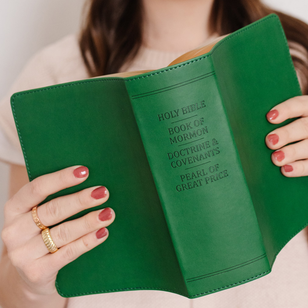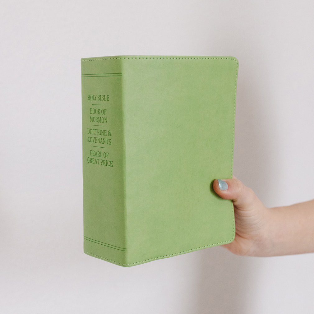 Our spring green simulated leather quad is a new addition to our collection of premium hand-bound scriptures. The cover is made from buttery soft faux leather and features stitching details and a modern imprinted spine design. Each quad is carefully hand-bound at our local offices, ensuring quality craftsmanship in every detail. To make your scriptures even more personal, we offer customization options, allowing you to choose from a variety of ribbon markers and add your name with...