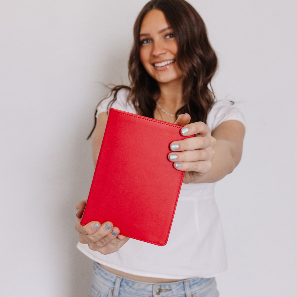 Our patriot red simulated leather quad is a new addition to our collection of premium hand-bound scriptures. The cover is made from buttery soft faux leather and features stitching details and a modern imprinted spine design. Each quad is carefully hand-bound at our local offices, ensuring quality craftsmanship in every detail. To make your scriptures even more personal, we offer customization options, allowing you to choose from a variety of ribbon markers and add your name with...