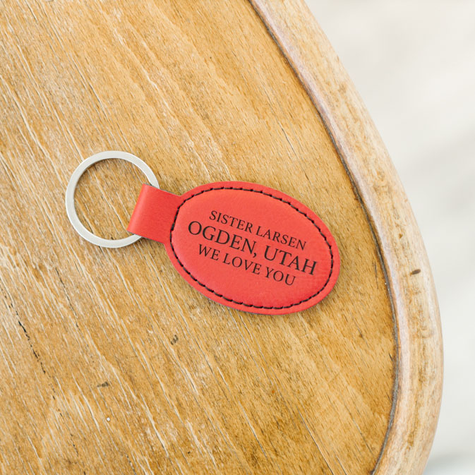 Our leatherette keychain features an elegant design of your name, mission, and special message in a variety of colors. The leatherette is soft and comfortable. This makes for a great gift and special keepsake for youth and missionaries. Available in the following colors: Bamboo, blue, gray, light brown, marble, pink, red, and teal.
