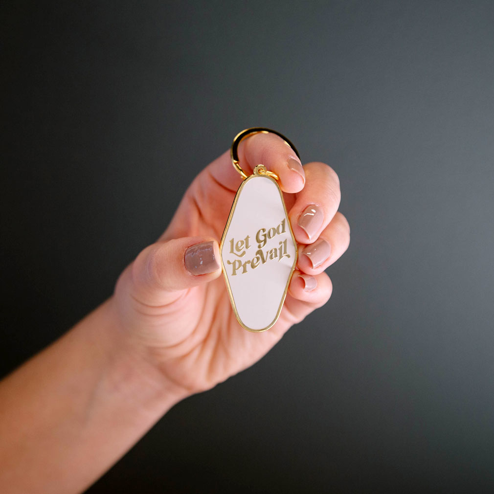 Our Let God Prevail keychain features an elegant design of the words Let God Prevail written in gold on a creamy white background. The keychain is made with gold enamel and features a matching...