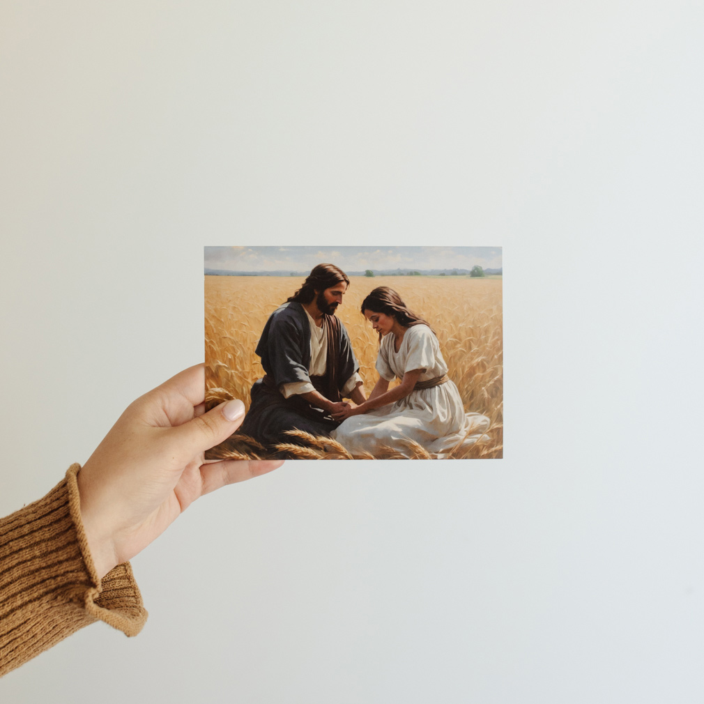 Our exclusive LDS art prints are designed to be compact and bring a sense of beauty and spirituality to your life wherever you go. This work features Christ comforting a young woman in a field of wheat. Each print features inspirational messages on the back to compliment the artwork. Our team at LDS Bookstore uses a combination of digital art techniques to make these beautiful exclusive images. "It is interesting that the first recorded instruction given to Adam after the Fall, dealt...