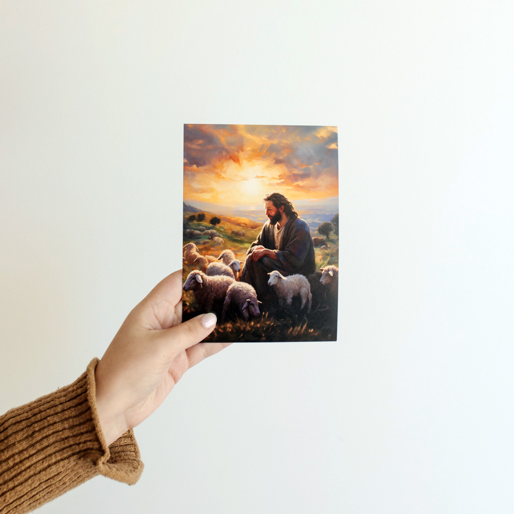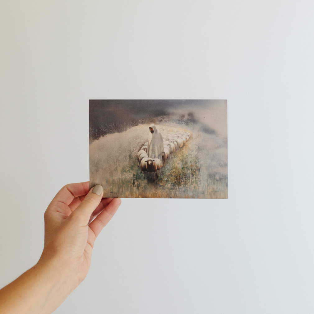 Our exclusive LDS art prints are designed to be compact and bring a sense of beauty and spirituality to your life wherever you go. This work features Christ cloaked in white and walking with a flock...