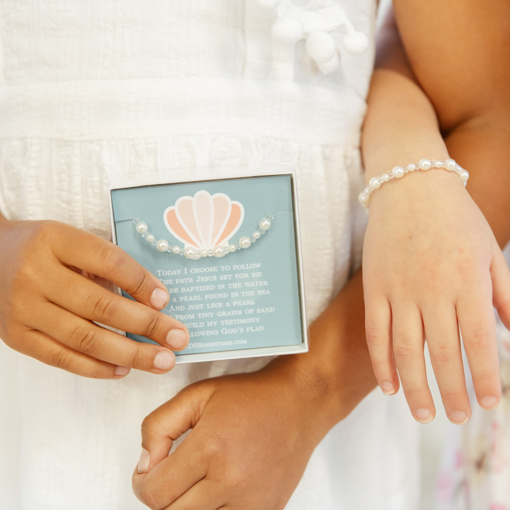 Our pearl baptism bracelets feature faux pearls and clear gems to give an elegant feel to any baptism. We offer two sizes, a small bracelet measuring 6" with the ability to extend to 6 3/4" length and a medium bracelet measuring 7 1/4" with the ability to extend to 8 1/2" length. Celebrate the baptism of any daughter of God with this beautiful pearl baptism bracelet. It features dainty faux pearls and gemstones in a repeating pattern. Each one is packaged in a white gift box with a clear lid....