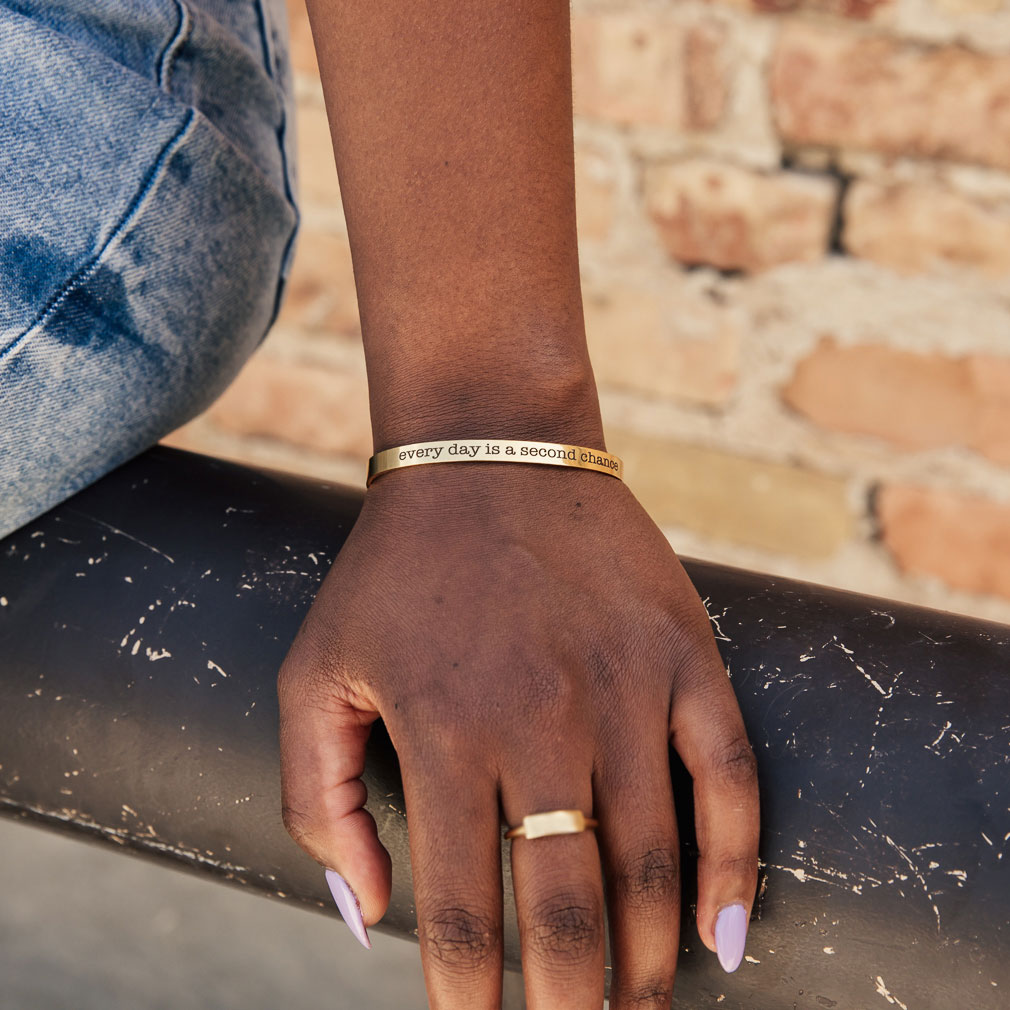 The reminder that "every day is a second chance" is a great reminder for anyone who believes in repentance and following Jesus Christ. This cuff bracelet has that important message on it. It comes in three stylish finishes: silver, gold, and rose gold. It measures 155mm x 5mm and has a thickness of 1.2mm. Each one is expertly engraved by hand.