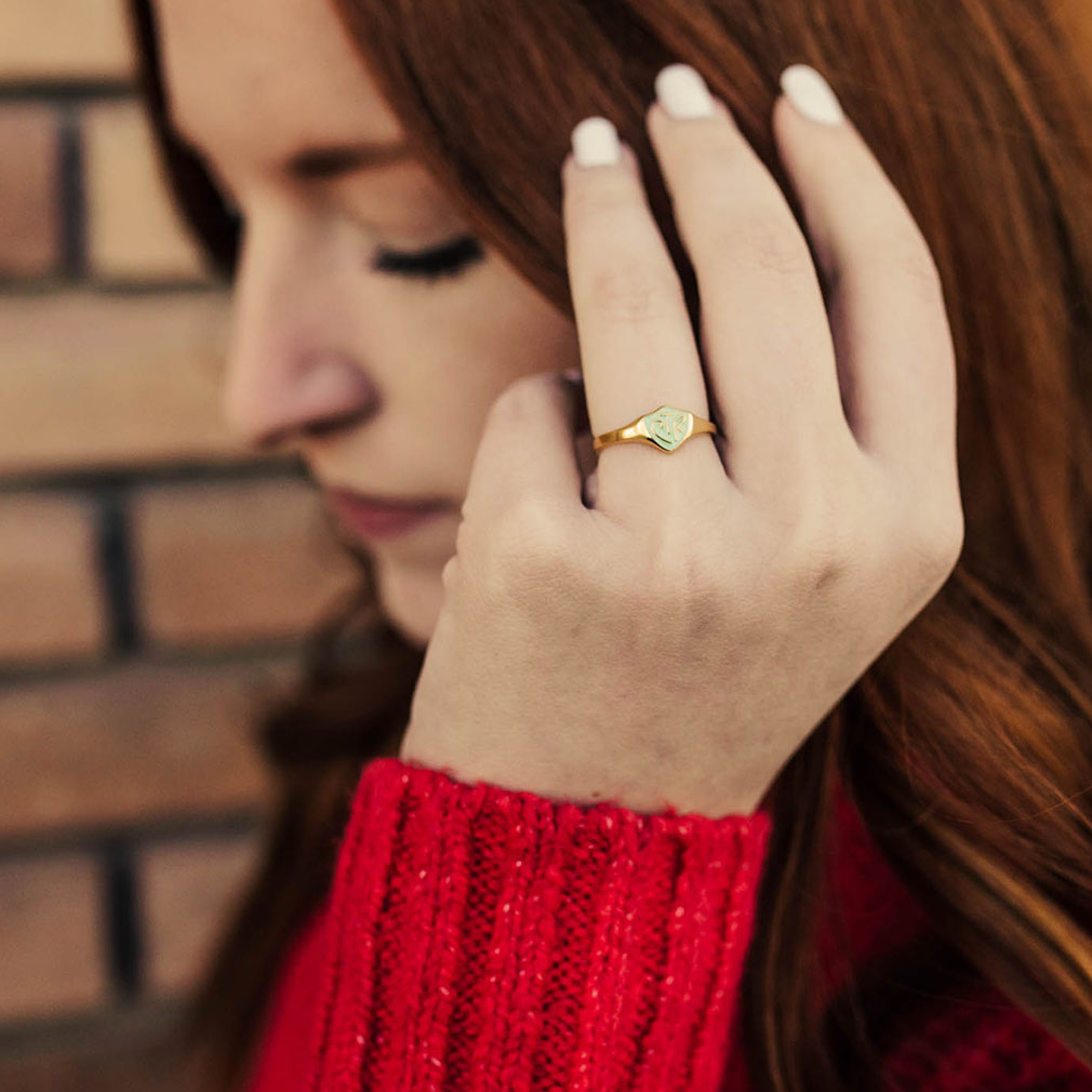 Our Mint & Gold CTR Ring is a fashionable update on the classic CTR ring design. It features a gold band with a mint green shield. Women of all ages are sure to love this ring.