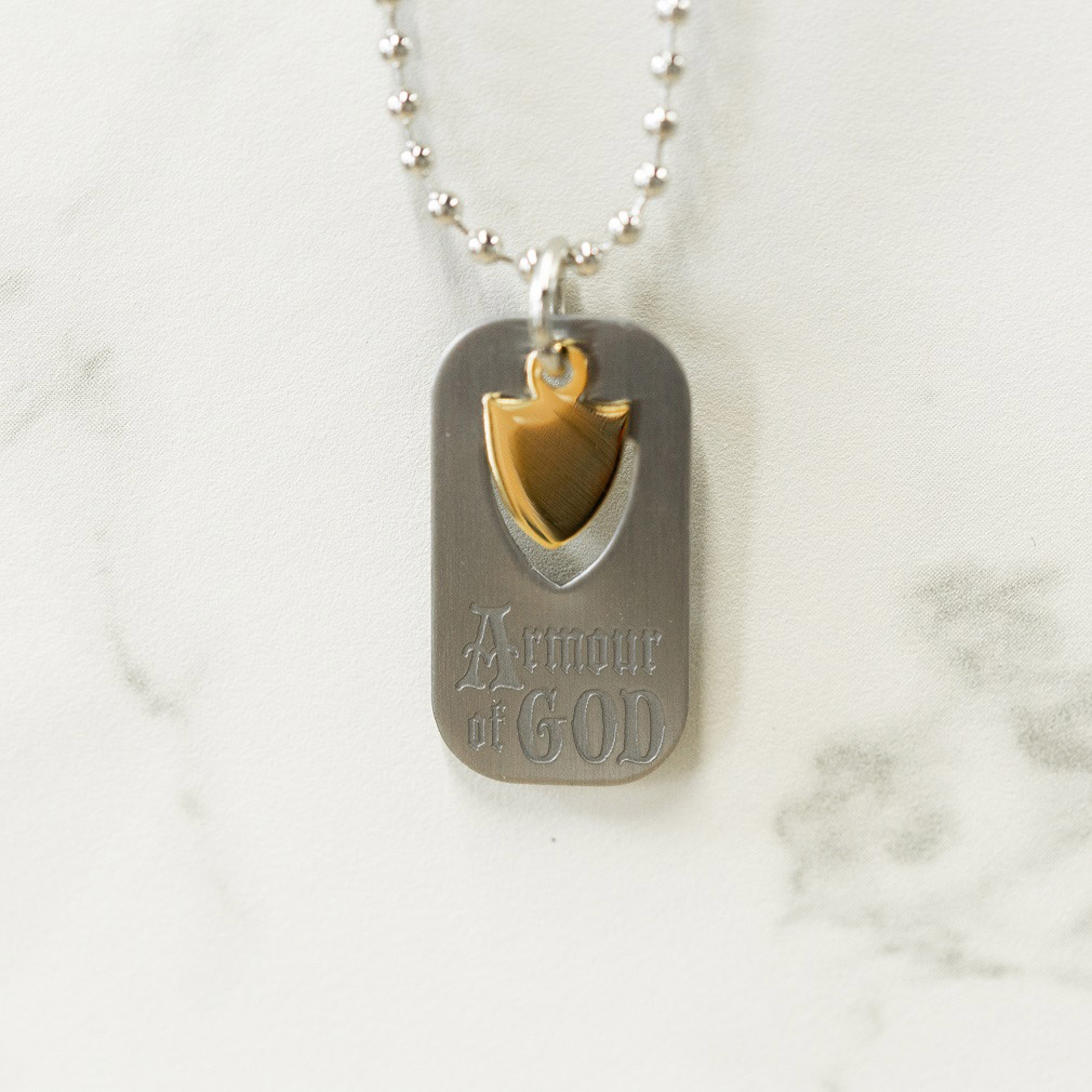 This beautiful necklace bears the words Armour of God with a gold-plated shield charm. Ephesians 6:13-17 13 Therefore put on the full armour of God, so that when the day of evil comes, you may be able to stand your ground, and after you have done everything, to stand. 14 Stand firm then, with the belt of truth buckled around your waist, with the breastplate of righteousness in place, 15 and with your feet fitted with the readiness that comes from the gospel of peace. 16 In addition to all...