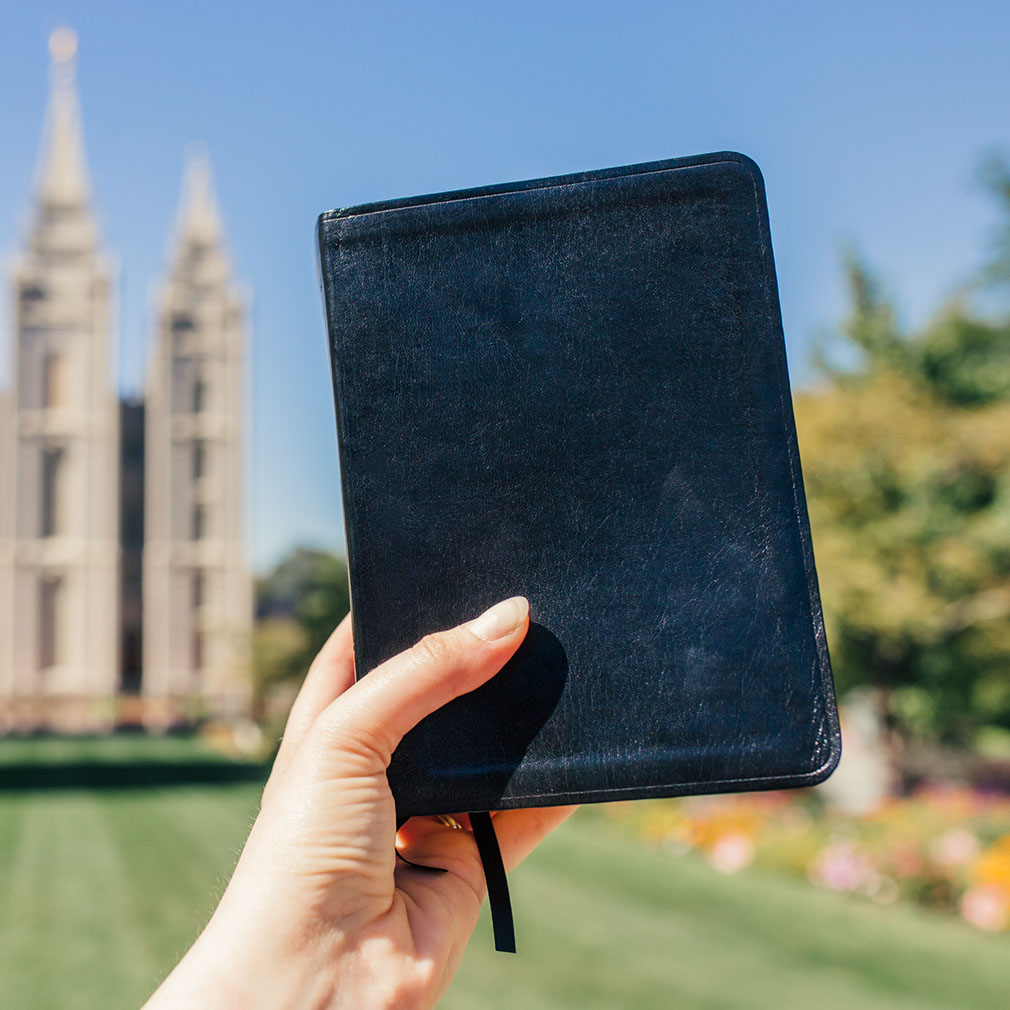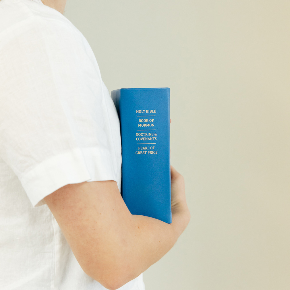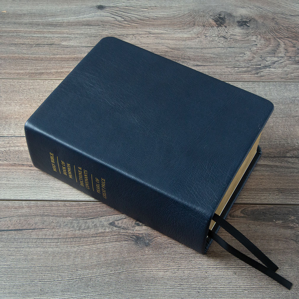 Crafted by hand and with an abundance of love and care, this hand-bound leather quad is a beautiful way to treasure up the word of God. Each one is made from the standard quadruple combination edition of the scriptures and features navy blue sheepskin leather for a luxurious and soft feel. It includes two satin ribbons in the color of your choice; add up to five ribbons for a small fee. This set of blue LDS scriptures was designed to help you fall in love with your scriptures...