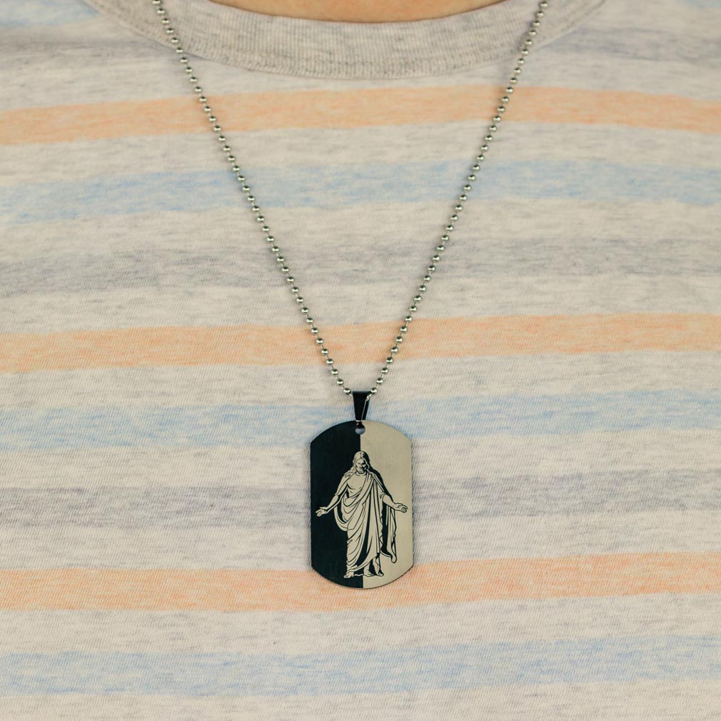 Our Christus Dog Tag Necklace features the popular image of the Christus statue as sculpted by Bertel Thorvaldsen. It includes a matching ball chain. Our dog tags are made of stainless steel.