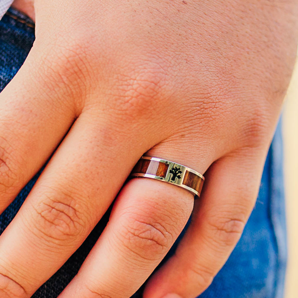 Stainless steel with actual wood inlay. A simple design of a tree engraved into the steel and surrounded by wood inlay all around the outside of the ring. The words "Tree of Life" are engraved on the inside of the ring as a special reminder to yourself.
