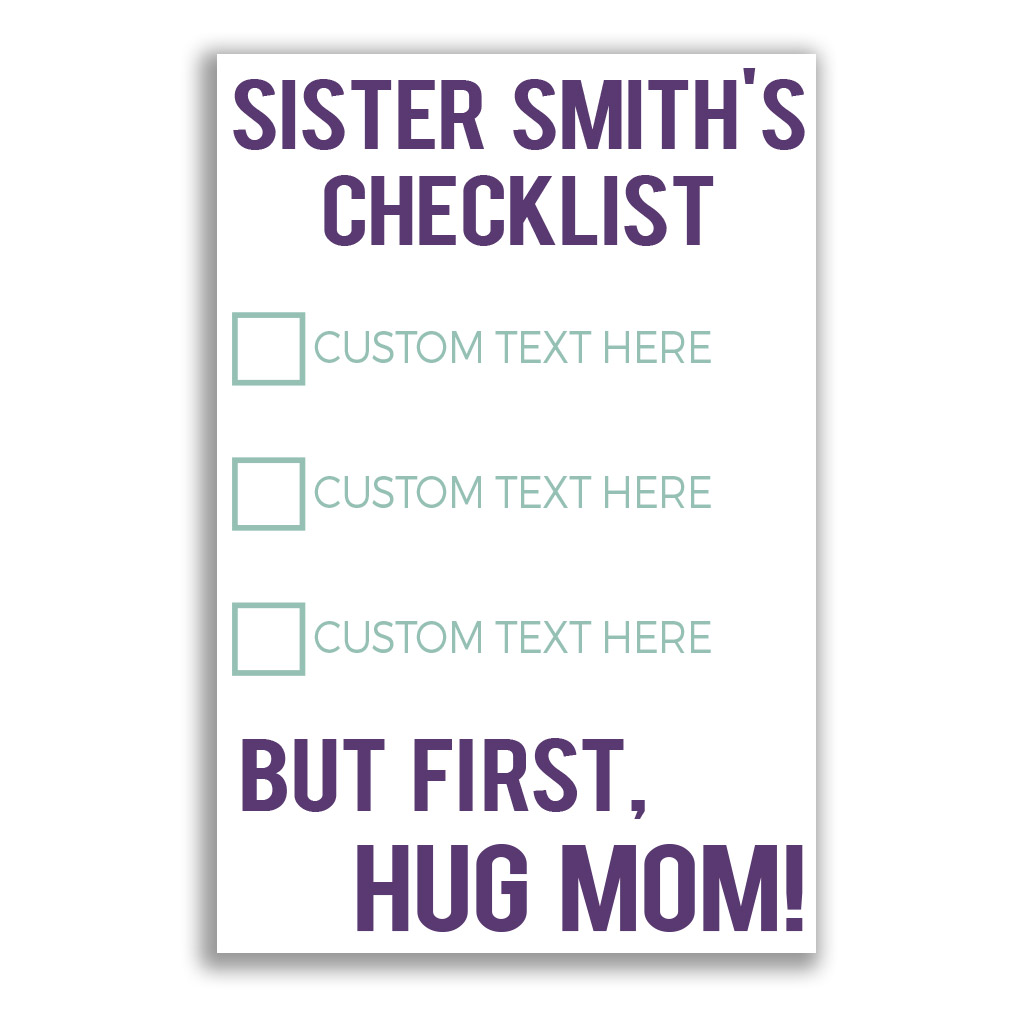 This fun welcome home poster for LDS missionaries features three custom text fields of things your missionary should do when they come home. The top features their name with the text "Elder/Sister's Checklist" while the bottom has the text "But First, Hug Mom!" Choose from two color options: navy and red or purple and teal. Your 24x36 poster comes as a coated matte finish print on 35lb heavyweight paper.