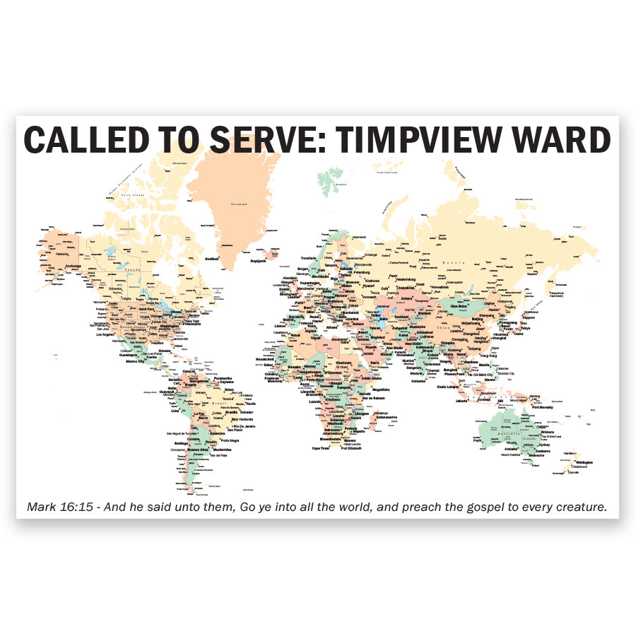 Our Personalized LDS World Mission Maps are the perfect way to celebrate multiple missionaries out serving. Each 36x24 poster is printed on durable, high-quality paper and features a colored world map with major countries and cities labeled.The top of the map can be personalized! After the text, Called to Serve, you can choose the name of your ward, your family name, or group. The bottom of each map features the scripture Mark 16:15, which states "And he said unto them, Go ye into all the...