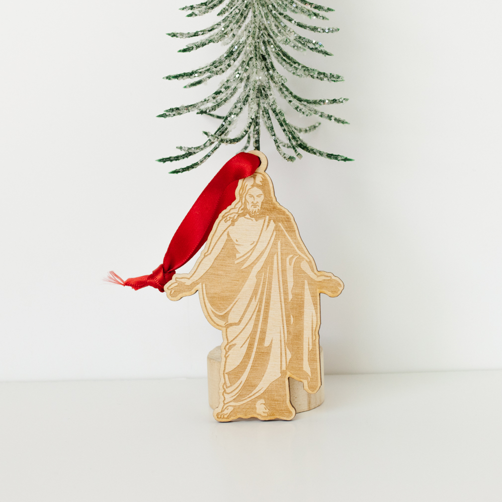 The Christus statue is one of the most beloved symbols of Jesus Christ for Latter-day Saints. Our Cutout Christus ornament takes the original statue and makes it fit for your Christmas tree. This ornament is made of genuine maple wood and features two-tone engraving for a warm, rustic look. Each one is approximately 4 inches tall and 2 3/4 inches wide. A red ribbon for hanging is included. Add personalized engraving on the back for an extra special gift. Use our Christus...