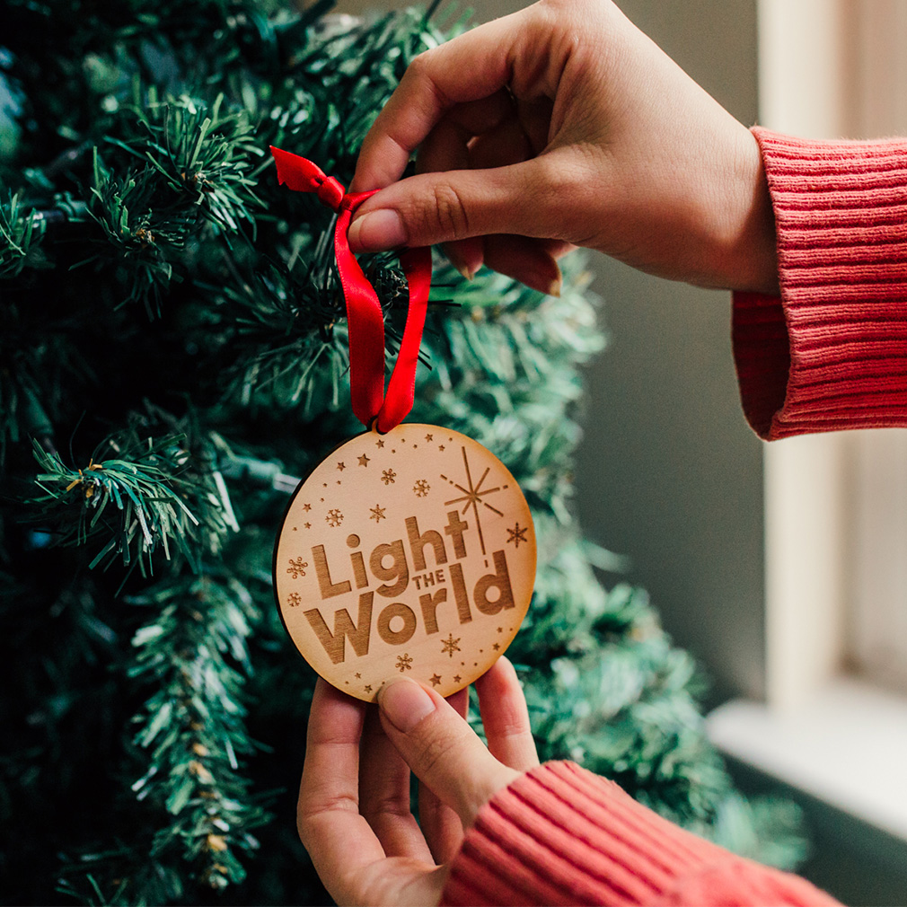 Invite the true spirit of Christmas into your holiday decor with our exclusive Light the World Ornament. Made of genuine maple wood, these ornaments are custom engraved for a warm, rustic look. It features a beautiful design of the Light the World logo, snowflake accents, and stars.This ornament makes a great gift for anyone on your list this holiday season. It is especially good for missionaries, church leaders, those you minister to, or anyone needing the light of Christ.Add back engraving...