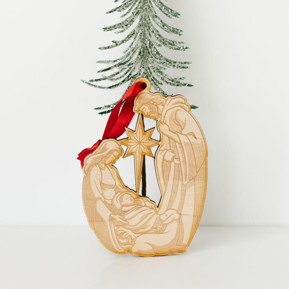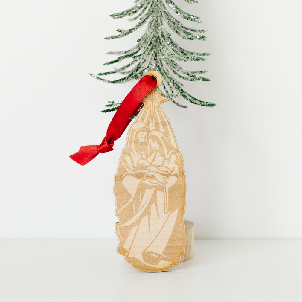 Our Holy Family Nativity Ornament features the tender scene of Mary and Joseph holding the newborn Christ. The radiance of the Christmas star shines down on them. This ornament is made of genuine maple wood and features two-tone engraving for a warm, rustic look. Each one is approximately 4 1/2 inches tall and includes a red ribbon for hanging. Add personalized engraving on the back for an extra special gift. Use our Holy Family Nativity Ornament to help your loved ones...