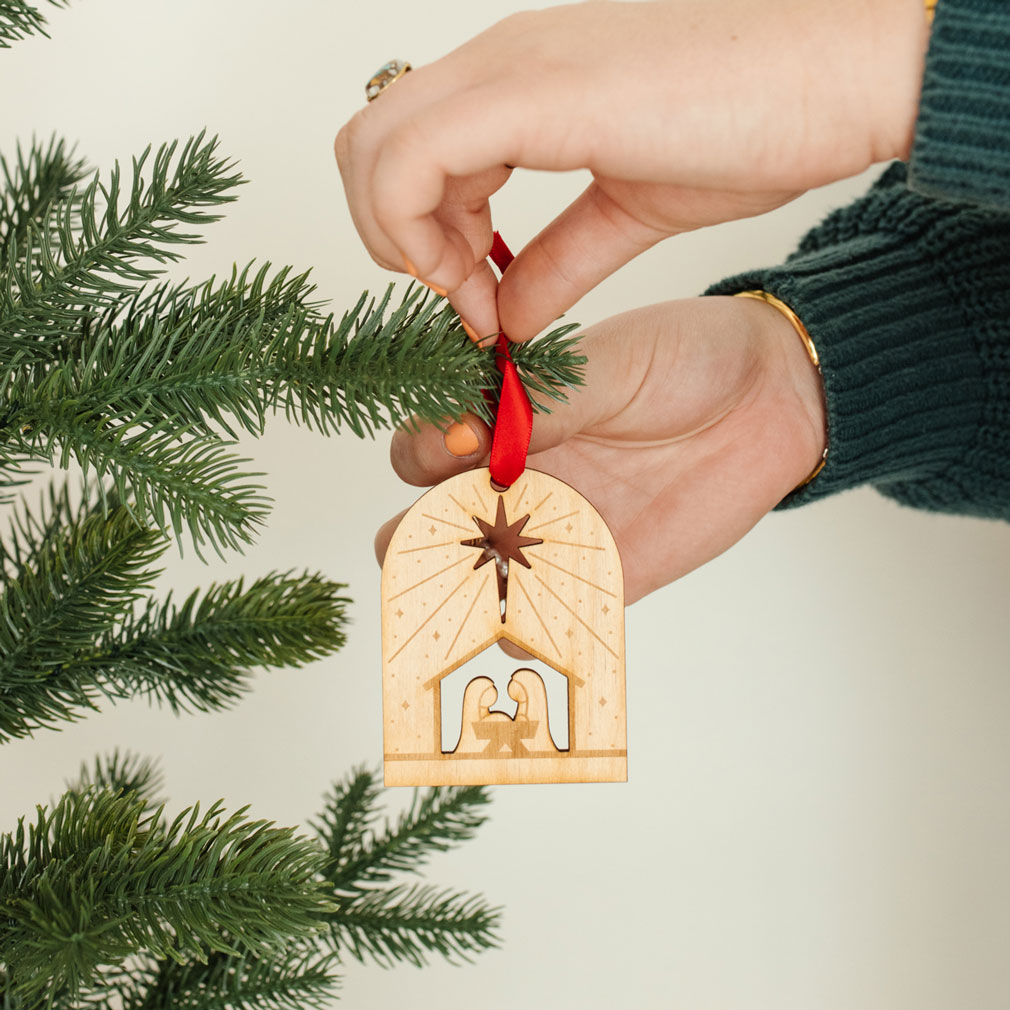 Light shines through our All Is Bright Nativity Ornament to illuminated both your tree and the Christmas season! It features a hand-engraved nativity scene on durable wood with special cutouts to help the lights from your tree shine through, illuminating the star and the stable. Each one is approximately 3 inches tall and includes a red ribbon for hanging. It makes a great gift for all Christians and pairs well as a gift with our The 25 Days of Christmas booklet. ...