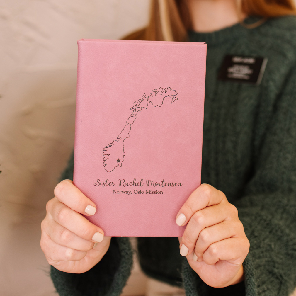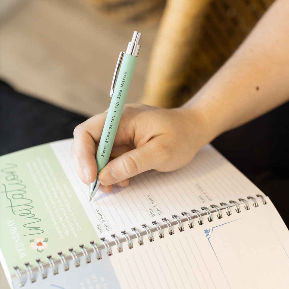 Help encourage your missionary to record spiritual impressions, take notes during zone conference, and keep track of important information with our personalized mission pen. It's a high-quality leatherette ballpoint pen with black ink. We'll add your name and mission engraved on the pen color of your choice—blue, teal, gray, pink, bamboo, or red. It pairs well will our personalized mission journal or missionary Book of Mormon. ...