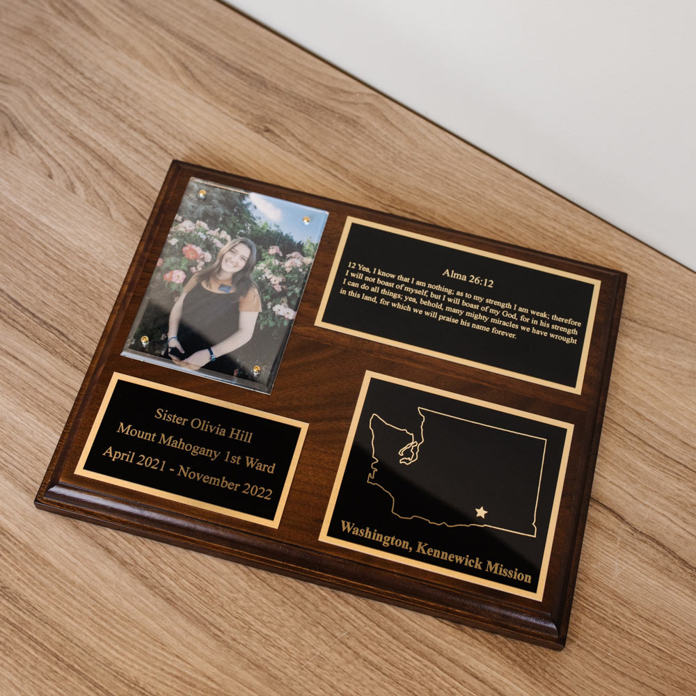 Hand-made missionary plaques honor past, present, and future missionaries. Our 8x10 missionary plaque displays your missionary's picture (3" x 4.25"), name, home ward, service area, mission...