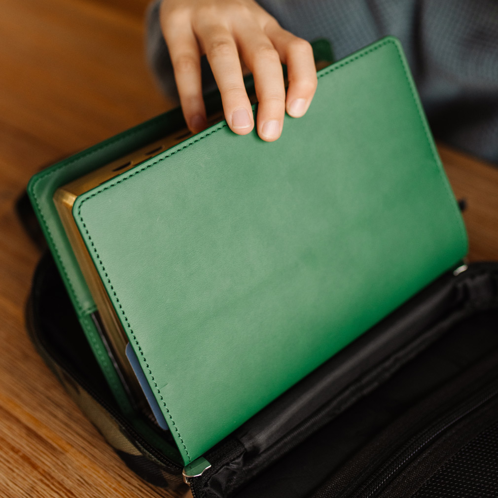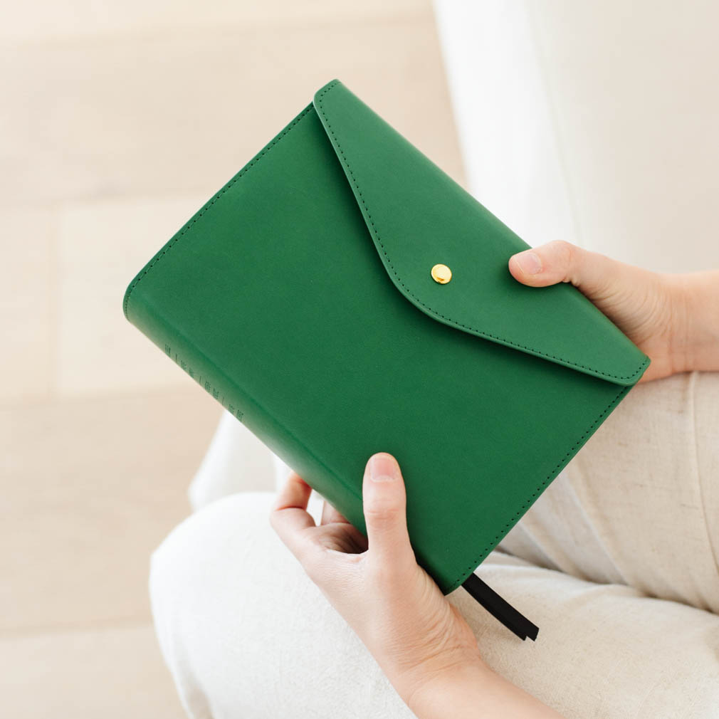 Our green simulated leather scripture cover is a great way to bring a fresh new look to your treasured scriptures. Personalize your scripture cover with a name and message for an additional fee....