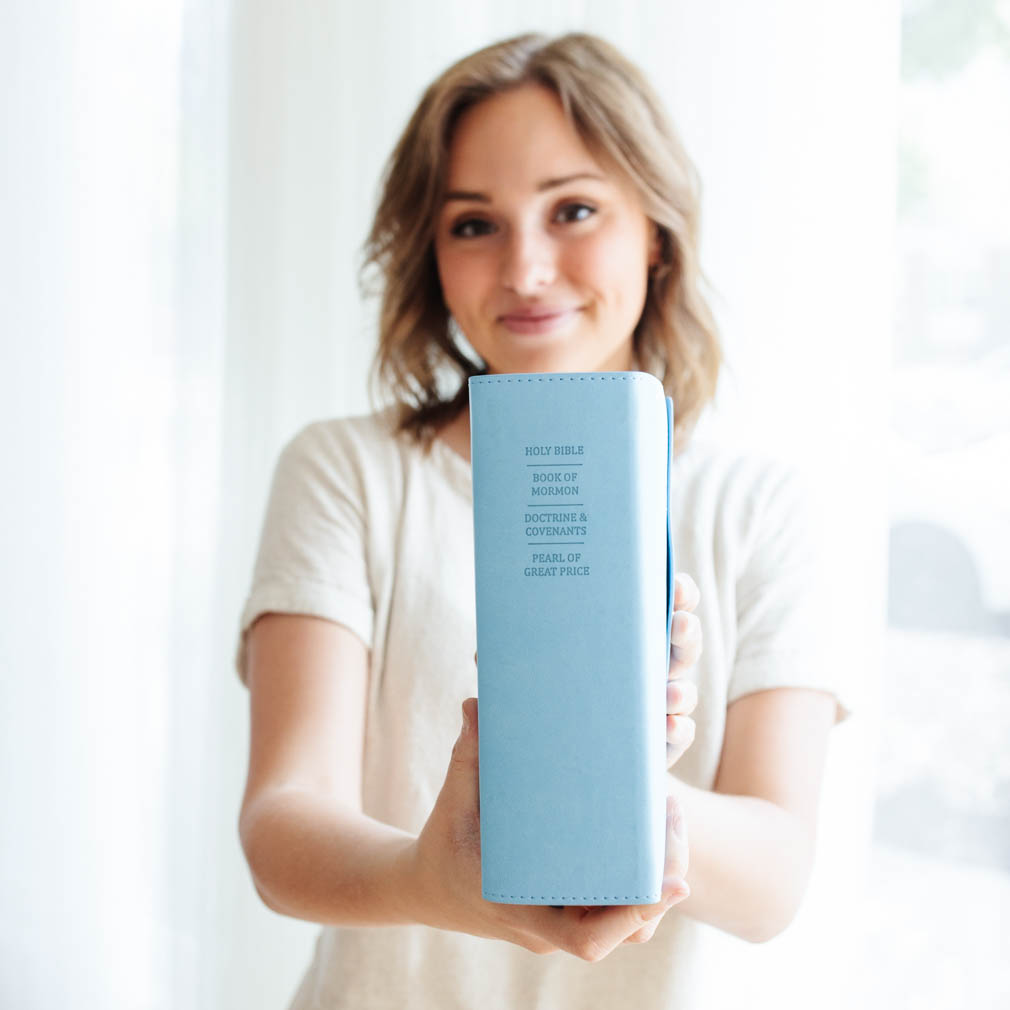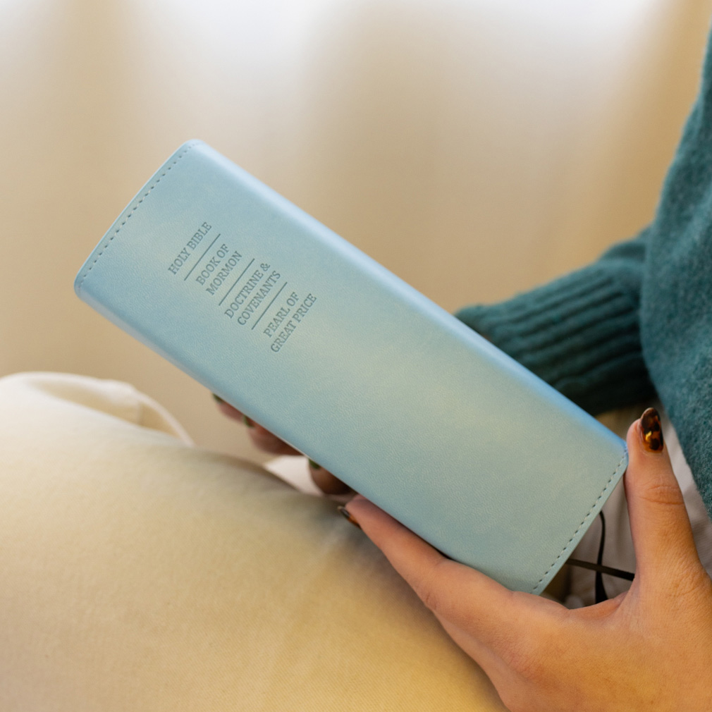 Our light blue simulated leather scripture cover is a great way to bring a fresh new look to your treasured scriptures. Personalize your scripture cover with a name and message for an additional fee. This scripture cover best fits the current size of quad combination scriptures with a cover that measures 7½" x 5¼". "What a glorious blessing! For when we want to speak to God, we pray. And when we want Him to speak to us, we search the scriptures; for His words are spoken through His...