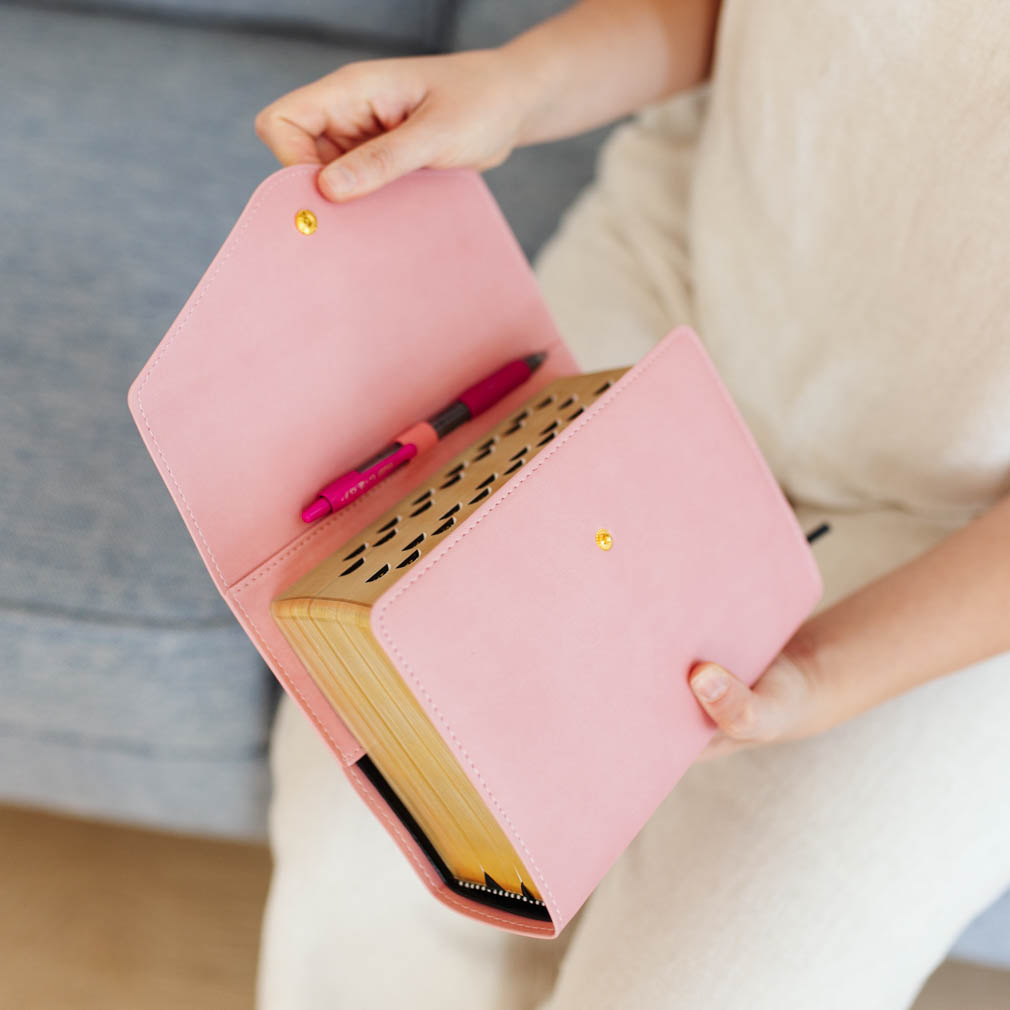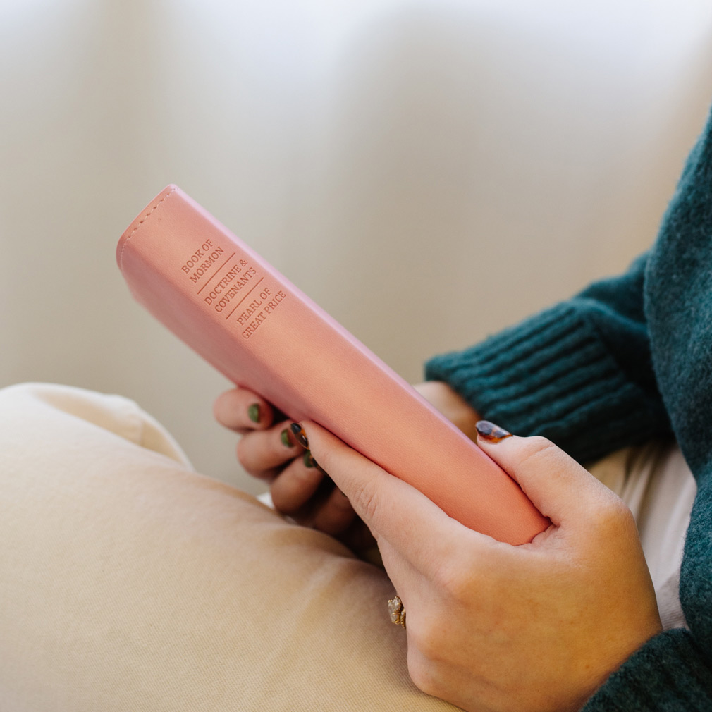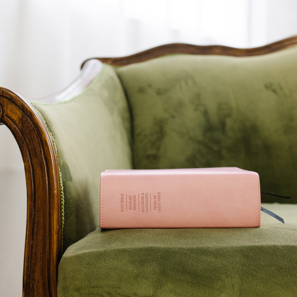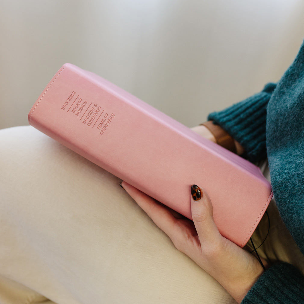 Our pink simulated leather scripture cover is a great way to bring a fresh new look to your treasured scriptures. Personalize your scripture cover with a name and message for an additional fee. This scripture cover best fits the current size of quad combination scriptures with a cover that measures 9½" x 6¼". "What a glorious blessing! For when we want to speak to God, we pray. And when we want Him to speak to us, we search the scriptures; for His words are spoken through His prophets. He...