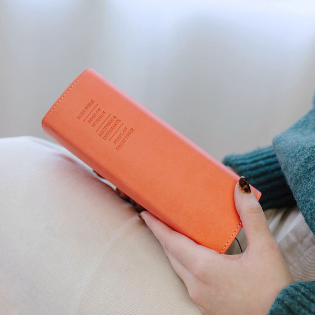 Our coral simulated leather scripture cover is a great way to bring a fresh new look to your treasured scriptures. Personalize your scripture cover with a name and message for an additional fee. This scripture cover best fits the current size of quad combination scriptures with a cover that measures 7½" x 5¼". "What a glorious blessing! For when we want to speak to God, we pray. And when we want Him to speak to us, we search the scriptures; for His words are spoken through His prophets....