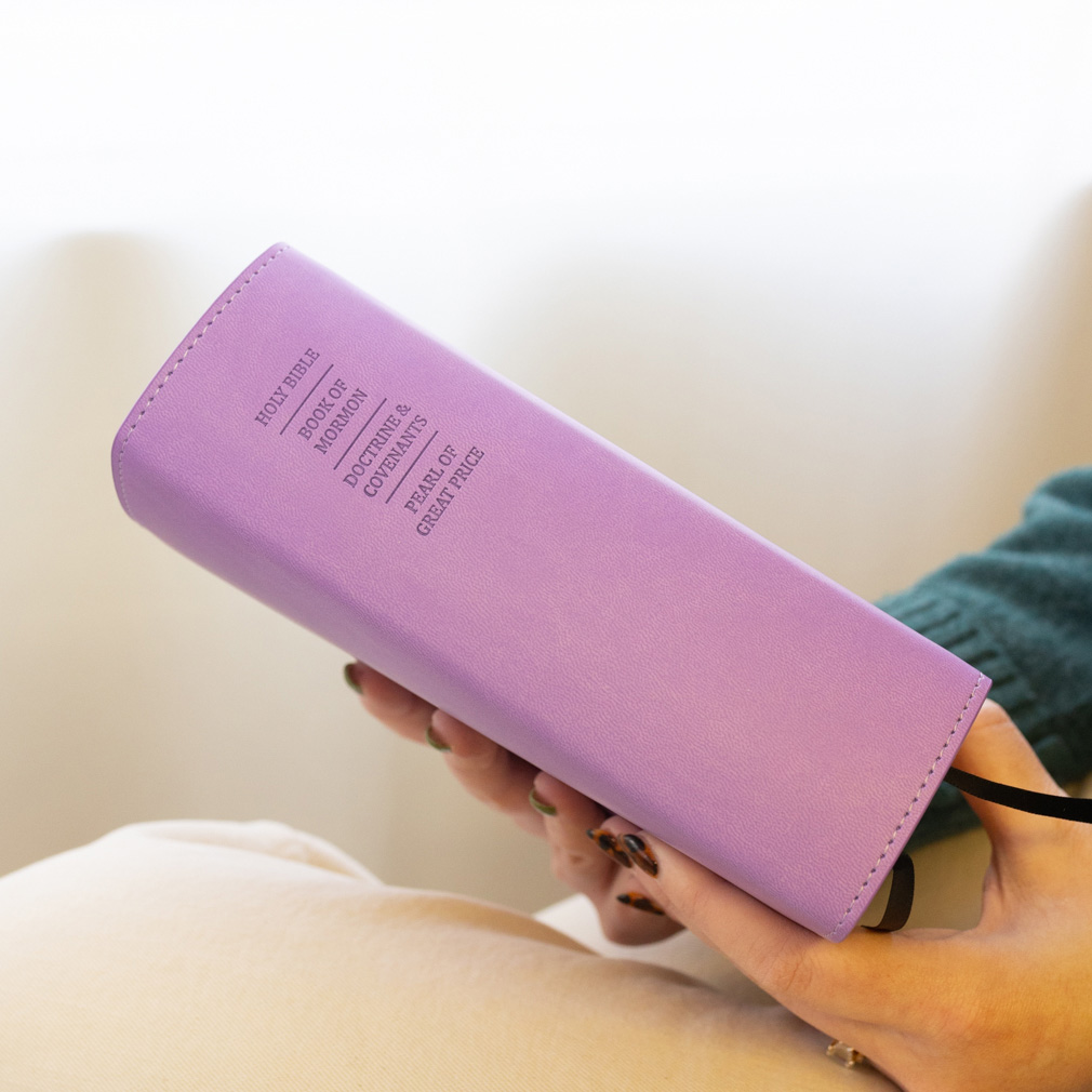 Our purple simulated leather scripture cover is a great way to bring a fresh new look to your treasured scriptures. Personalize your scripture cover with a name and message for an additional fee. This scripture cover best fits the current size of quad combination scriptures with a cover that measures 7½" x 5¼". "What a glorious blessing! For when we want to speak to God, we pray. And when we want Him to speak to us, we search the scriptures; for His words are spoken through His prophets....