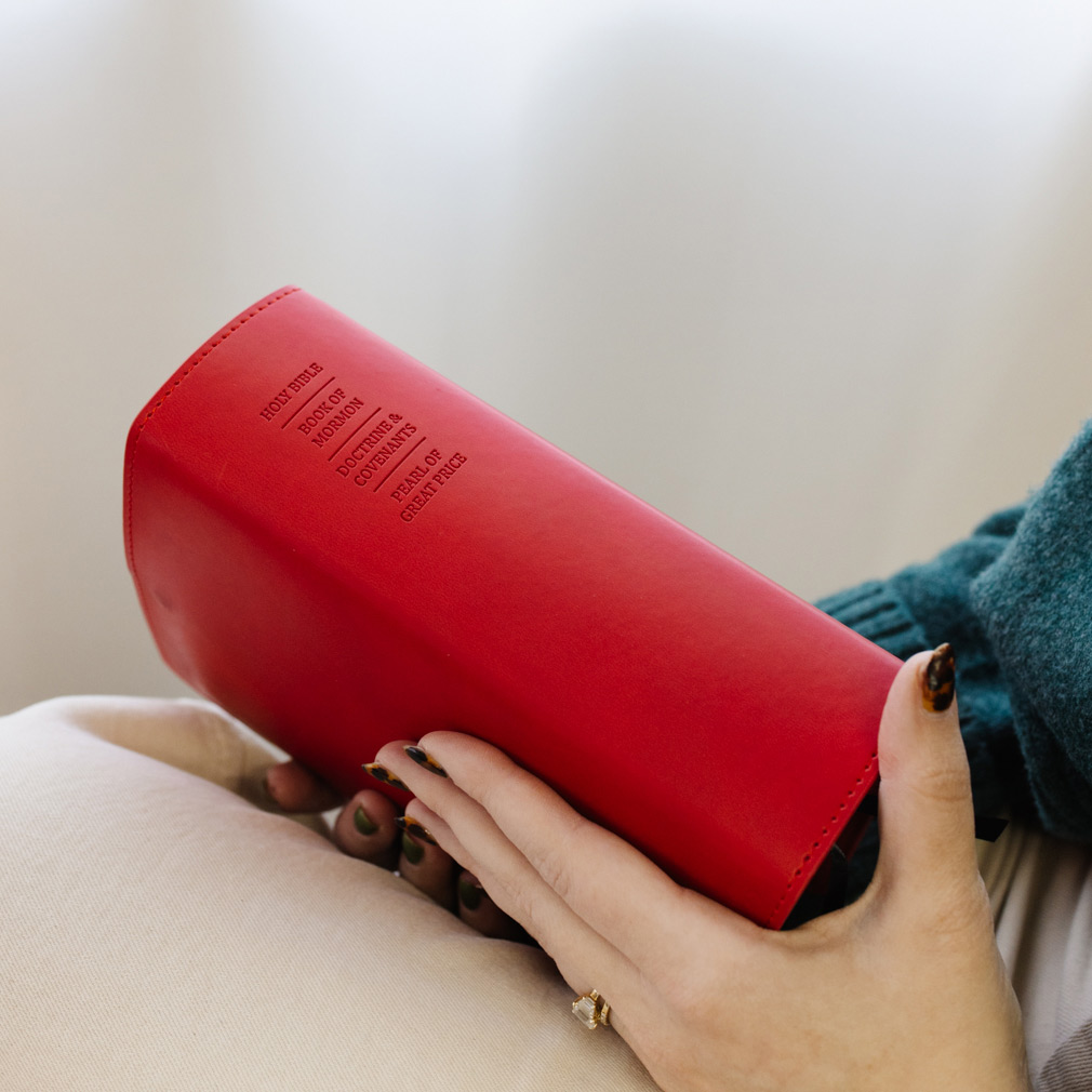 Our red simulated leather scripture cover is a great way to bring a fresh new look to your treasured scriptures. Personalize your scripture cover with a name and message for an additional fee. This scripture cover best fits the current size of quad combination scriptures with a cover that measures 7½" x 5¼". "What a glorious blessing! For when we want to speak to God, we pray. And when we want Him to speak to us, we search the scriptures; for His words are spoken through His prophets. He...