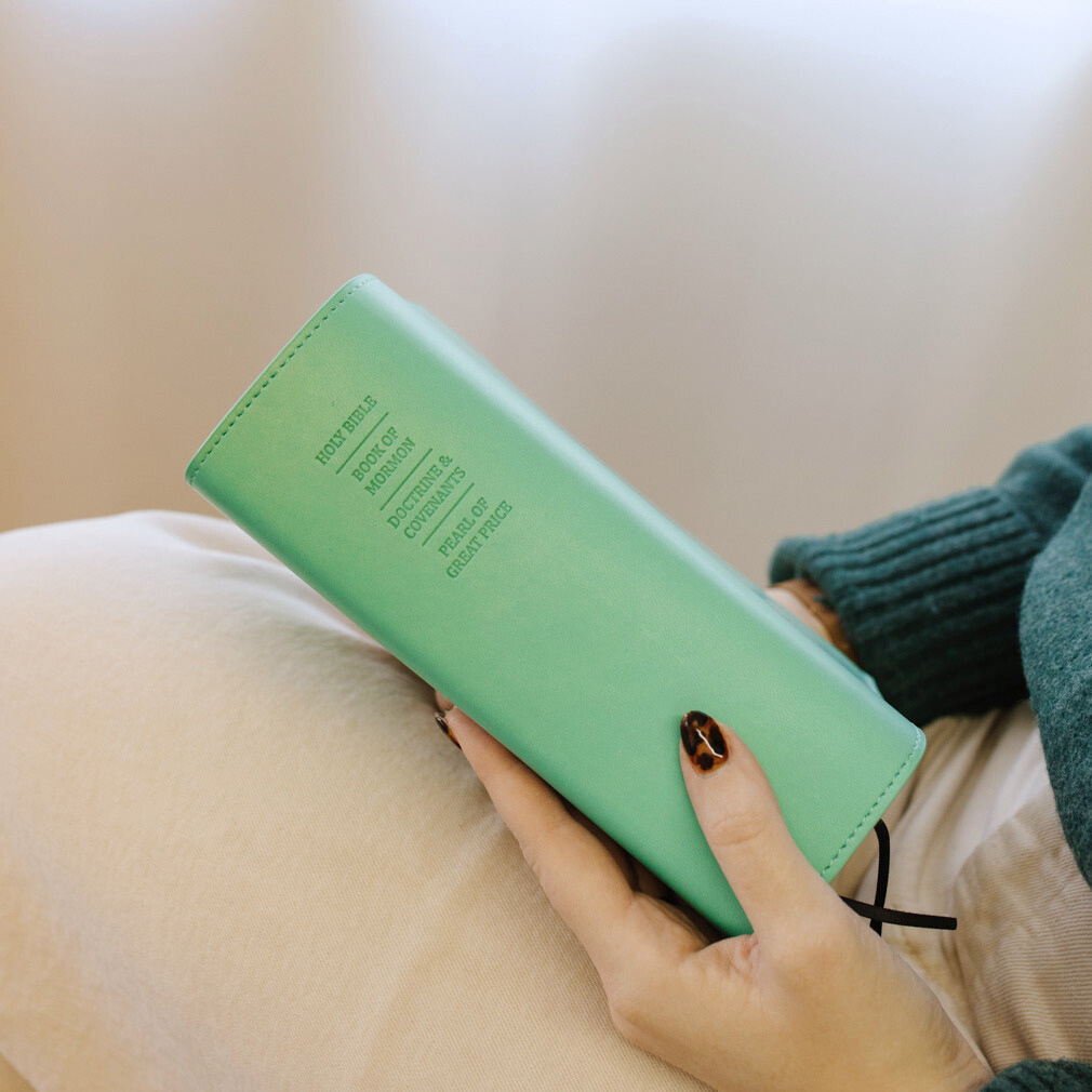 Our turquoise simulated leather scripture cover is a great way to bring a fresh new look to your treasured scriptures. Personalize your scripture cover with a name and message for an additional fee. This scripture cover best fits the current size of quad combination scriptures with a cover that measures 7½" x 5¼". "What a glorious blessing! For when we want to speak to God, we pray. And when we want Him to speak to us, we search the scriptures; for His words are spoken through His...
