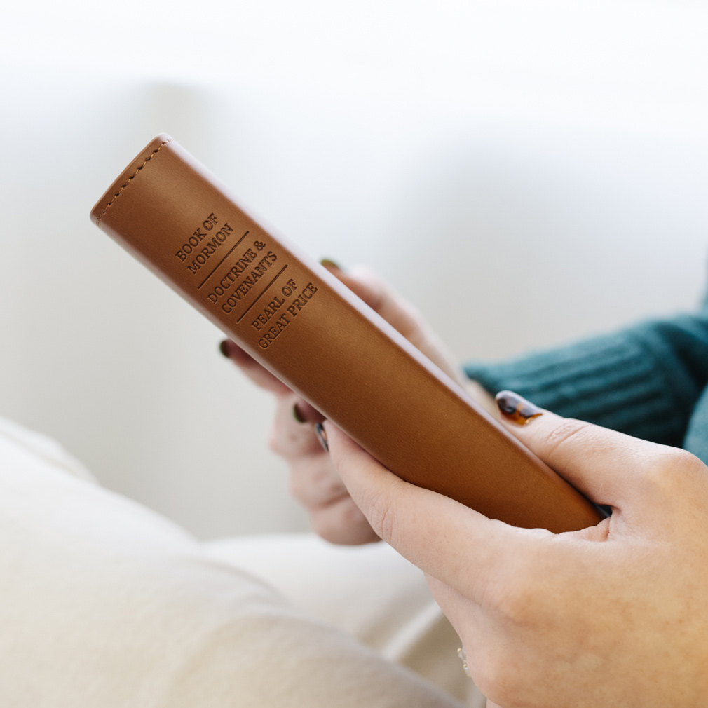 Our brown simulated leather scripture cover is a great way to bring a fresh new look to your treasured scriptures. Personalize your scripture cover with a name and message for an additional fee. This scripture cover best fits the current size of quad combination scriptures with a cover that measures 7½" x 5¼". "What a glorious blessing! For when we want to speak to God, we pray. And when we want Him to speak to us, we search the scriptures; for His words are spoken through His prophets....