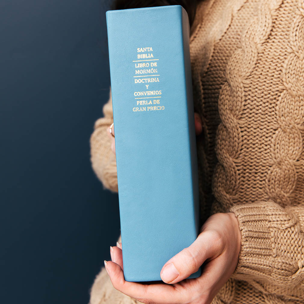Crafted by hand and with an abundance of love and care, this hand-bound leather Spanish quad is a beautiful way to treasure up the word of God. Each one is made from the standard quadruple combination edition of the scriptures and features genuine sheepskin leather for a luxurious and soft feel. It includes two satin ribbons in the color of your choice; add up to five ribbons for a small fee. This set of Spanish LDS scriptures was designed to help you fall in love with your scriptures all over...