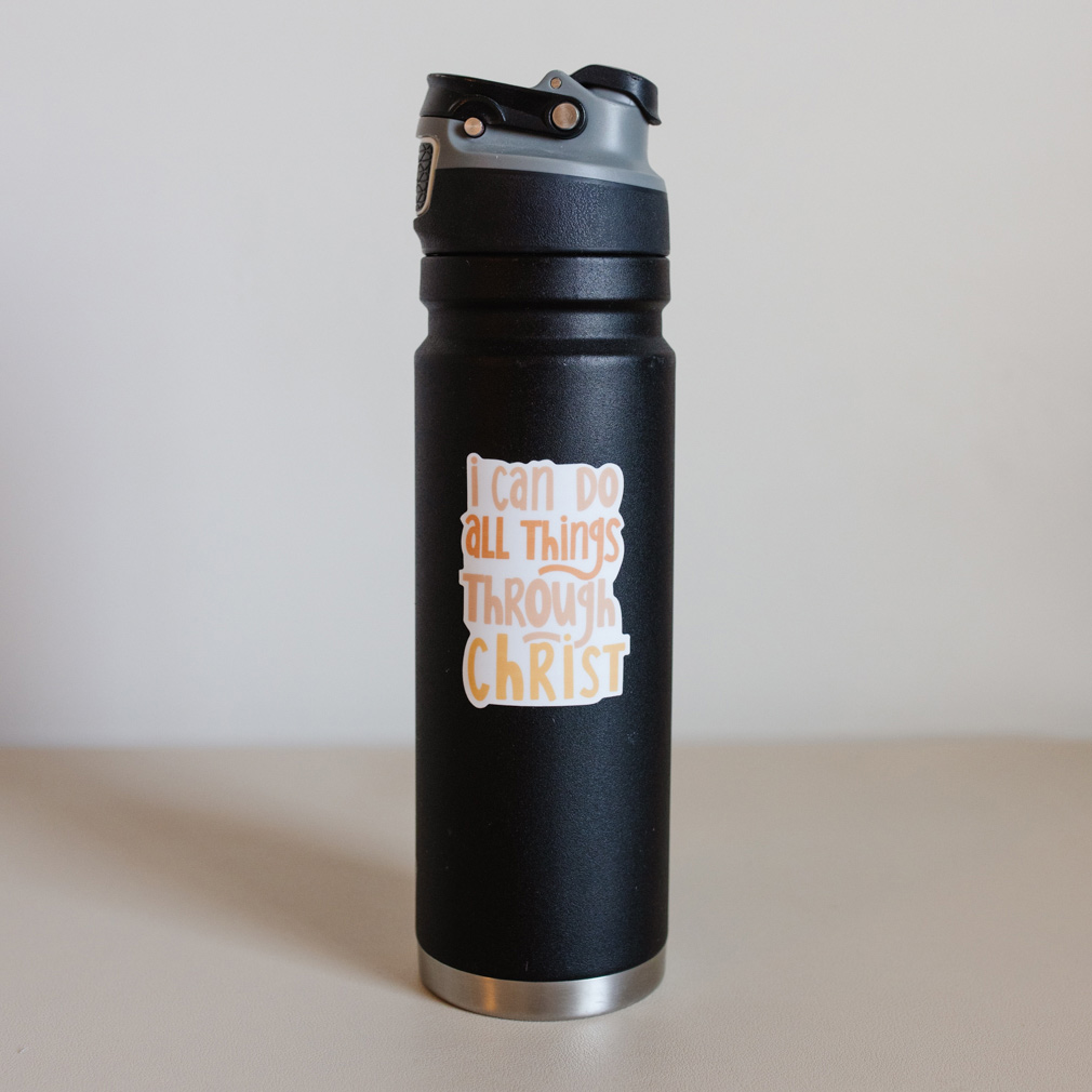 Our I Can Do All Things Through Christ vinyl sticker is perfect for water bottles, laptops, phone cases, and more. It measures approximately 2" x 2.5" and makes a great gift for all ages. Our vinyl stickers are both waterproof and removeable, leaving no sticky residue on important surfaces. Our stickers are not acid-free.