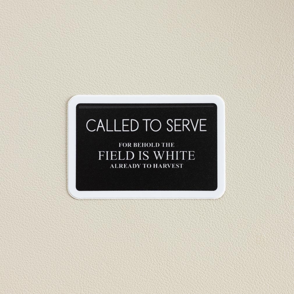 This special sticker was designed with Latter-day Saint missionaries in mind. It features a black missionary tag with the phrase "Called to Serve" and "For Behold The Field is White Already to...